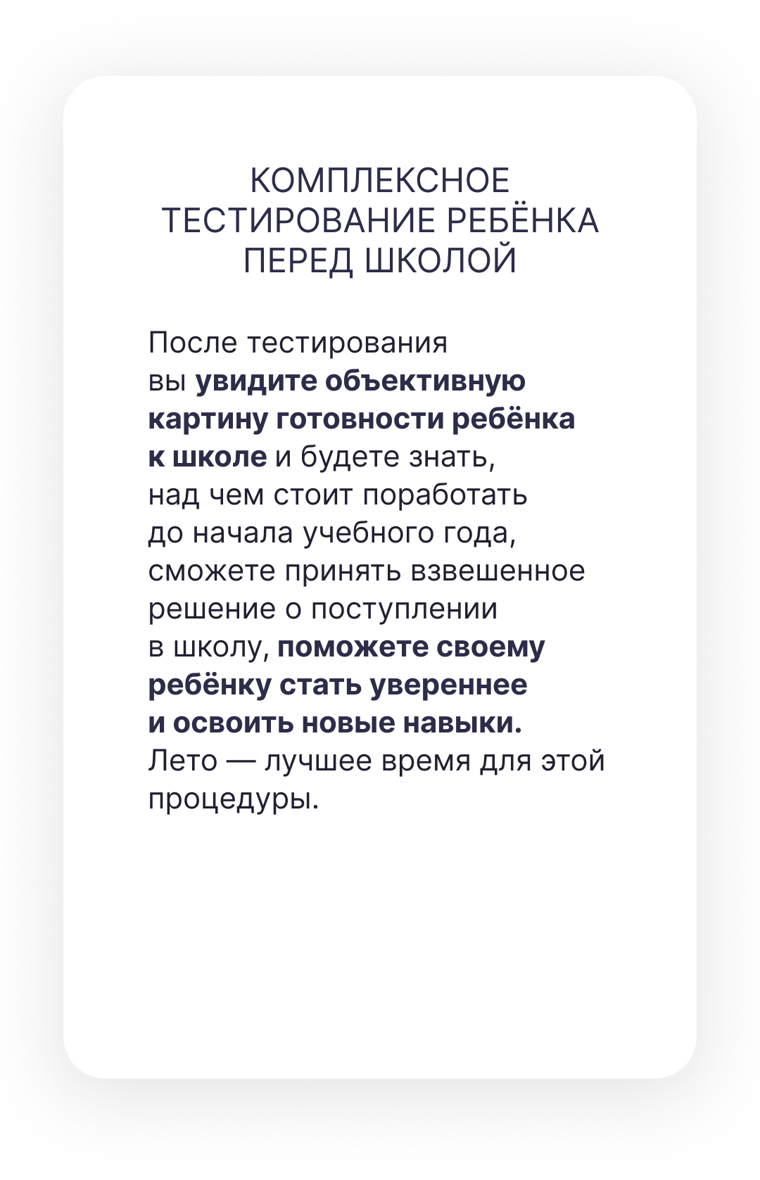 После тестирования вы увидите объективную картину готовности ребёнка к школе и будете знать, над чем стоит поработать до начала учебного года, сможете принять взвешенное решение о поступлении в школу, поможете своему ребёнку стать увереннее и освоить новые навыки. Лето — лучшее время для этой процедуры.